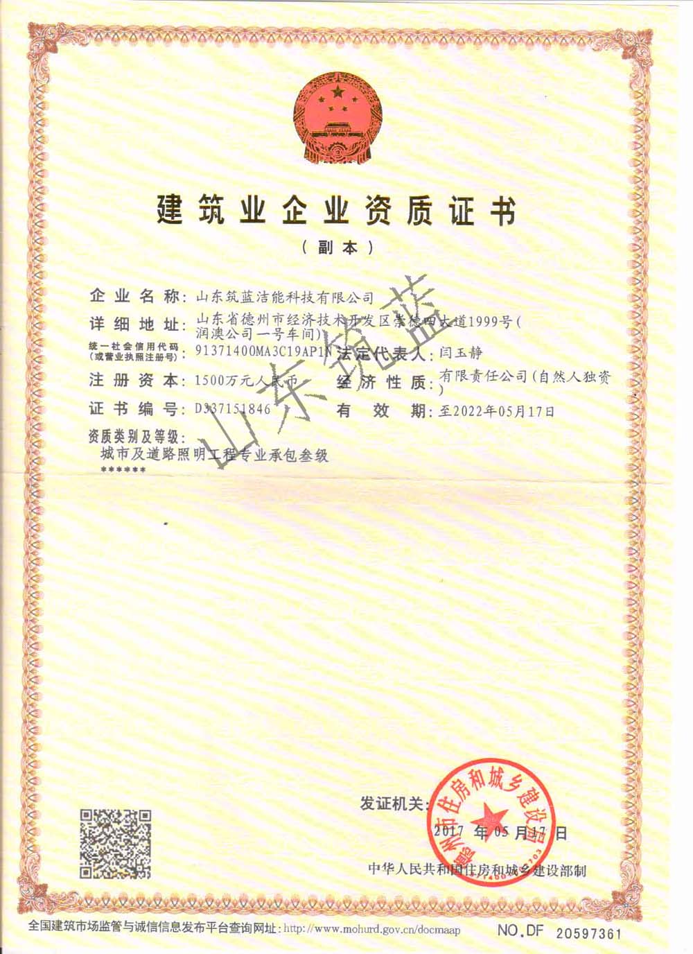 山東筑藍(lán)潔能科技有限公司創(chuàng)建于2015年,擁有建筑業(yè)企業(yè)資質(zhì)證書(shū)--城市及道路照明工程專業(yè)承包叁級(jí),是一家集設(shè)計(jì)、生產(chǎn)制造、安裝服務(wù)于一體的新能源企業(yè),專業(yè)從事太陽(yáng)能路燈、LED路燈、高桿燈、庭院燈、景觀燈、中華燈、草坪燈、光伏設(shè)備、風(fēng)能發(fā)電設(shè)備的生產(chǎn)及銷售、安裝及售后服務(wù);同時(shí)還從事凈水設(shè)備、空氣凈化器、光伏采暖設(shè)備、燃?xì)鉄崴鳌C(jī)電設(shè)備、玻璃鋼制品的銷售、安裝,LED照明及亮化產(chǎn)品、太陽(yáng)能熱水器、光伏設(shè)備及元器件生產(chǎn)、銷售、安裝;建筑裝飾裝修工程施工、兼建筑幕墻工程施工、建筑智能化工程施工等產(chǎn)品專業(yè)生產(chǎn)加工的公司,擁有完整、科學(xué)的質(zhì)量管理體系。