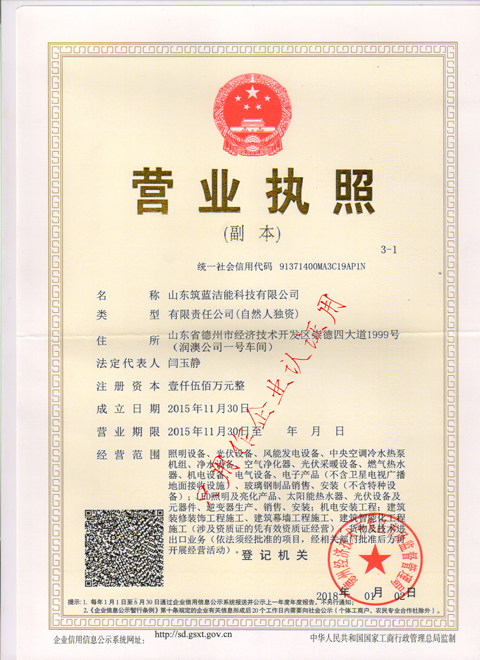 山東筑藍潔能科技有限公司創建于2015年,擁有建筑業企業資質證書--城市及道路照明工程專業承包叁級,是一家集設計、生產制造、安裝服務于一體的新能源企業,專業從事太陽能路燈、LED路燈、高桿燈、庭院燈、景觀燈、中華燈、草坪燈、光伏設備、風能發電設備的生產及銷售、安裝及售后服務;同時還從事凈水設備、空氣凈化器、光伏采暖設備、燃氣熱水器、機電設備、玻璃鋼制品的銷售、安裝,LED照明及亮化產品、太陽能熱水器、光伏設備及元器件生產、銷售、安裝;建筑裝飾裝修工程施工、兼建筑幕墻工程施工、建筑智能化工程施工等產品專業生產加工的公司,擁有完整、科學的質量管理體系。